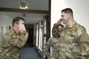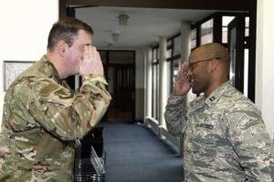 U.S. Air Force Capt. Alex Johnson, 86th Airlift Wing chaplain (right), salutes U.S. Air Force Brig. Gen. Mark R. August, 86th AW commander, after being coined by August on Ramstein Air Base, Jan. 17. Johnson supports 14 units as their primary chaplain, while also preaching weekly at the Ramstein Chapel’s protestant service, and conducting counseling sessions.