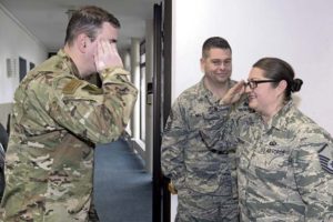 U.S. Air Force Master Sgt. Norma Johnson, 86th Airlift Wing readiness and training flight chief (right), salutes U.S. Air Force Brig. Gen. Mark R. August, 86th AW commander, after being coined by August on Ramstein Air Base, Jan. 17. Johnson supports base religious programs, spiritual care, crisis intervention counseling and advices leadership on religious matters affecting Airmen.