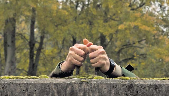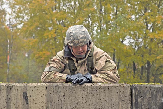 An explosive ordnance disposal ruck march participant climbs over a wall Oct. 30 on Ramstein.