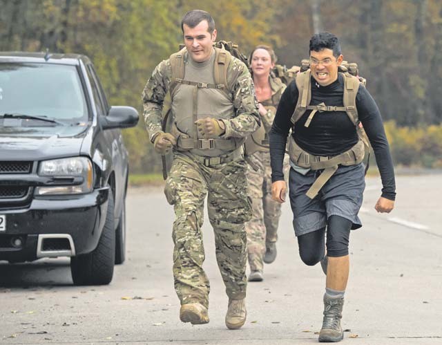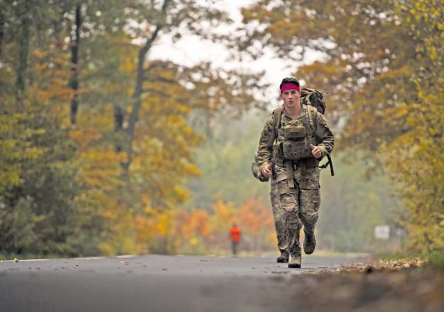Airman 1st Class Kevin Leyden, 786th Civil Engineer Squadron explosive ordnance disposal technician, jogs along a trail during a ruck march Oct. 30 on Ramstein. The ruck march mirrored an EOD course where participants traversed three miles, climbed a six-foot wall and carried jerry cans for 50 meters all while wearing a 50-pound pack as part of the event. The course was held to help raise money for the 2015 Combined Federal Campaign-Overseas. The mission of the CFC-O is to support and promote philanthropy through a voluntary program that is employee-focused, cost-efficient and effective in providing all federal employees the opportunity to improve the quality of life for all.