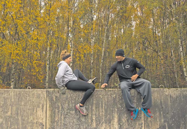 Participants in an explosive ordnance disposal ruck march climb over a six-foot wall together Oct. 30 on Ramstein.