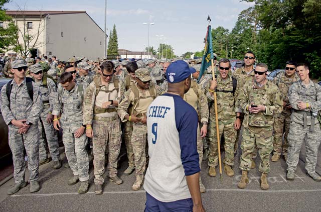 U.S. Airmen wait to begin a 10K ruck during the Second Annual Chief Master Sgt. of the Air Force Paul Airey Memorial Ruck/March/Run June 2 on Ramstein. Airey served as a B-24 aerial gunner during World War II. After crashing on enemy territory and becoming a prisoner of war, Airey and other prisoners of war were forced to march approximately 400 miles across Germany, after which Airey was eventually rescued.