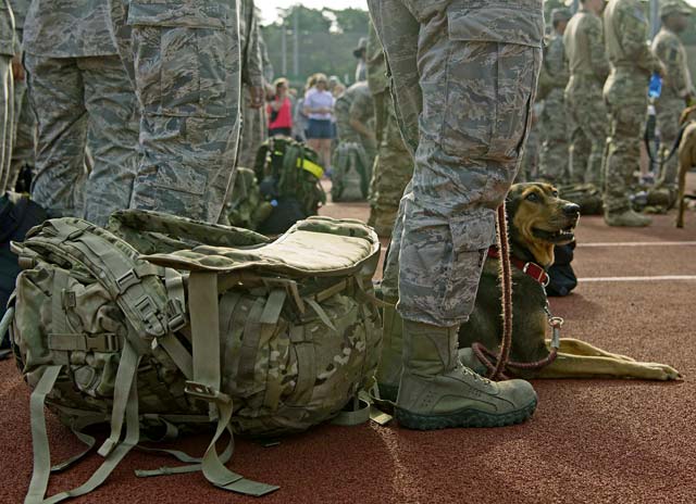 U.S. Airmen wait to begin a 10K ruck during the event. Approximateley 500 Airmen participated in the memorial events, including a 5K and 10K run or walk and a 10K ruck with 1st, 2nd, and 3rd place prizes. Proceeds from the event went to the Air Force Enlisted Village, a community in Florida supporting spouses of enlisted Airmen.