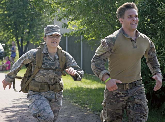 The winners of the race charge for the finish line June 2 on Ramstein. Teams from various squadrons in the Kaiserslautern Military Community area took on the 10K ruck march challenge. Participants were allowed to walk or run but they had to be in uniform and carry 25lb rucks, or backpacks, from start to finish.