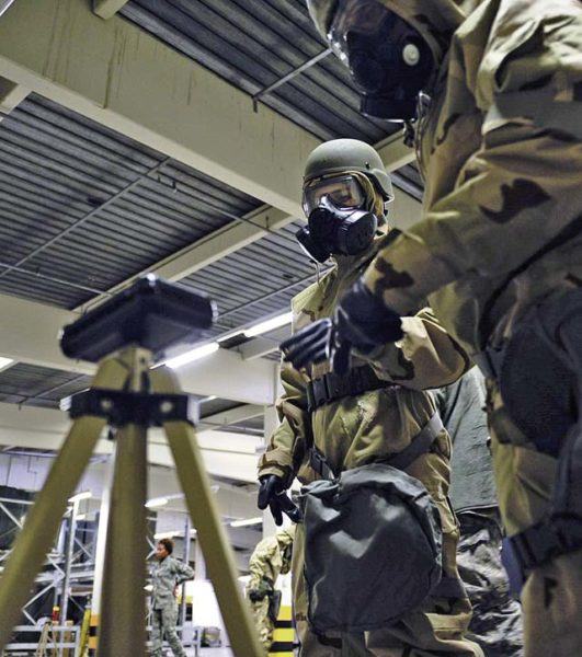 Senior Airman Kenneth Sargent, 1st Communications Maintenance Squadron cable and antenna theater maintenance technician, receives a chemical, biological, radiological and nuclear defense check during a CBRN course Jan. 4 on Ramstein. During the course, Airmen conducted CBRN defense checks to ensure the absence of contamination.