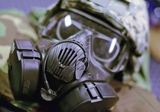 A chemical, biological, radiological and nuclear defense face mask is displayed during a CBRN defense course Jan. 5 on Ramstein. CBRN defense protective measures are taken in situations where CBRN warfare hazards may be present.