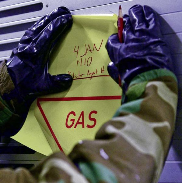 A chemical, biological, radiological and nuclear defense course participant posts a contamination sign on the back of a truck during a CBRN defense course Jan. 4 on Ramstein. During the CBRN defense course, Airmen are taught how to inspect equipment, use detection equipment and prepare for CBRN attacks.
