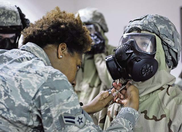 Airman 1st Class Bria Jackson, 786th Civil Engineer Squadron emergency management logistics apprentice (left), helps Master Sgt. Erica Jordan, 86th Logistics Readiness Squadron superintendent, tighten her face mask during a chemical, biological, radiological and nuclear defense course Jan. 3 on Ramstein. The CBRN defense course trains Airmen how to properly wear and maintain their equipment, among other skills.