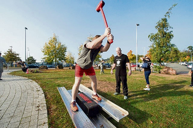 Throughout the morning and afternoon, teams raced to multiple “road blocks,” which required them to complete a task before receiving a clue to the next station. Notable obstacles found at the road blocks included a bean-bag toss, Frisbee-golf, a scavenger hunt at the base library, trivia at the base Community Bank and PAX Terminal, and an activity known by U.S. Air Force firefighters as the Keiser sled physical exertion test, which is used by service members as a test of physical stamina.