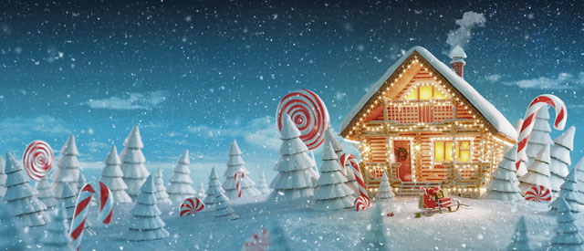 Amazing,Log,House,Decorated,Of,Christmas,Lights,In,Magical,Forest