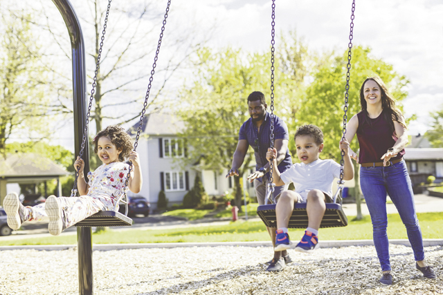 A,Playtime,Moments.,Family,With,Child,Swinging,Having,Fun,On