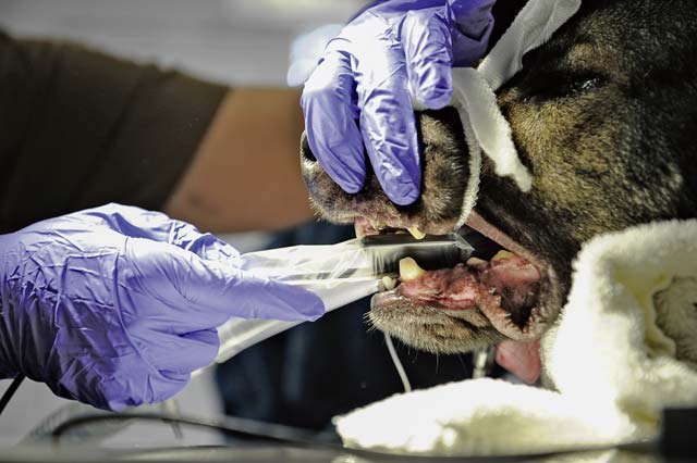After biting down onto a steel pipe during training, Kobo, 86th Security Forces Squadron MWD, recently underwent two non-surgical procedures for the extraction of his upper incisors and a surgical extraction of his upper fourth premolar at Veterinary Medical Center Europe, Pulaski Barracks, Aug. 25.