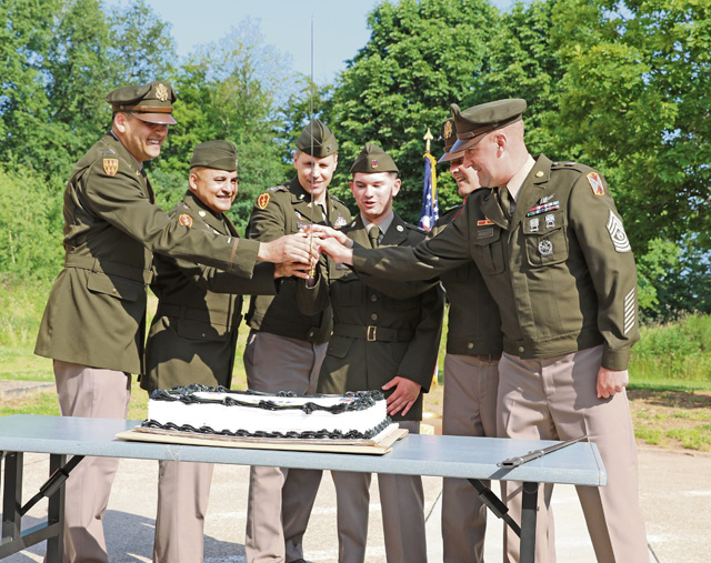 SEMBACH, Germany – Army units from across Sembach Kaserne gathered on Friday June 13 to celebrate the Army’s 250th Birthday and conduct a reenlistment ceremony. U.S. Army Col. Jeremy Johnson (center), chief of staff for Medical Readiness Command, Europe and Sgt. Maj. Carlos Orsinicarrero (2nd from left) from Dental Health Command Europe take part in the Army birthday cake cutting. This year’s Army Birthday theme, “This we’ll defend,” was first used as a battle cry by the Continental Army. Today, it reminds us that our Army’s purpose is clear: to fight and win the nation’s wars. The Army remains committed to honing their warfighting skills, enforcing standards and discipline, and living the values that have defined the Army for the past 250 years.