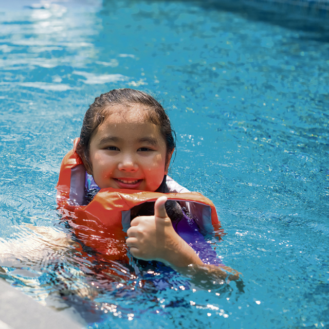 Asian,Child,Playing,In,The,Pool.,Wearing,Orange,Life,Jacket,