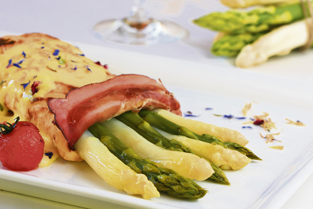 Veal Steak topped with Asparagus, smothered in Hollandaise Sauce served with Melted Tomatoes & Carrots Vichy