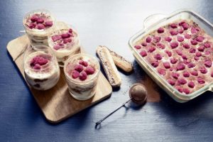 - In a small glass dish arrange half of the sponge fingers and pour half of the Amaretto and coffee mixture on top. Add half of the raspberry mixture to the dish. Repeat the layers again.