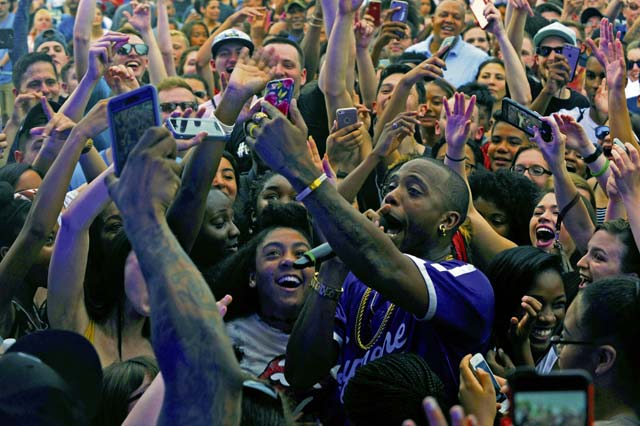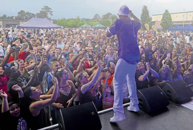 B.o.B, rapper and music producer, shakes fans’ hands during a performance May 28 on Ramstein.