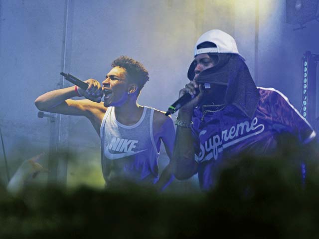 Asiah Shannon, left, son of Tech. Sgt. Kristina Shannon, 86th Communications Squadron postmaster, performs with rapper and music producer B.o.B during a free concert May 28 on Ramstein. The musical artist picked Shannon from the audience and invited him to perform a song.