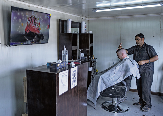 U.S. Air Force Maj. Ryley Paquette, 776th Expeditionary Air Base Squadron Mission Support deputy commander, receives a haircut at Chabelley Airfield, Djibouti, Jan. 31, 2026. Chabelley Airfield recently received a new on-site barbershop to support quality of life for deployed personnel. (U.S. Air Force photo by Staff Sgt. Christian Silvera)