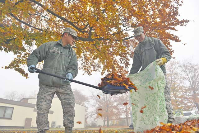 Staff Sgt. Tenzin Choegoyab and Airman 1st Class Ahmad Yehudah, both 86th Airlift Wing Command Post emergency action controllers, scoop up leaves during Base Pride Day Nov. 3 on Ramstein. Airmen and civilians around Ramstein were tasked to clean around their working areas during the biannual occasion. The two-day event gave base personnel time to beautify the base by picking up trash and raking leaves.