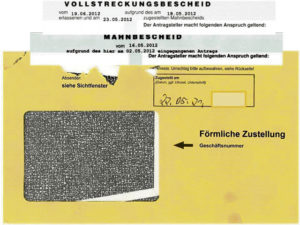 In the event you forget to pay, or somehow the invoice, reminder to pay, or warning letter from a collection agency never reaches you, never ignore the yellow envelop, especially if the document in the yellow envelope is either a Mahnbescheid or a Vollstreckungsbescheid. Both documents are orders issued by a German court at the request of the creditor, but one is more serious than the other.