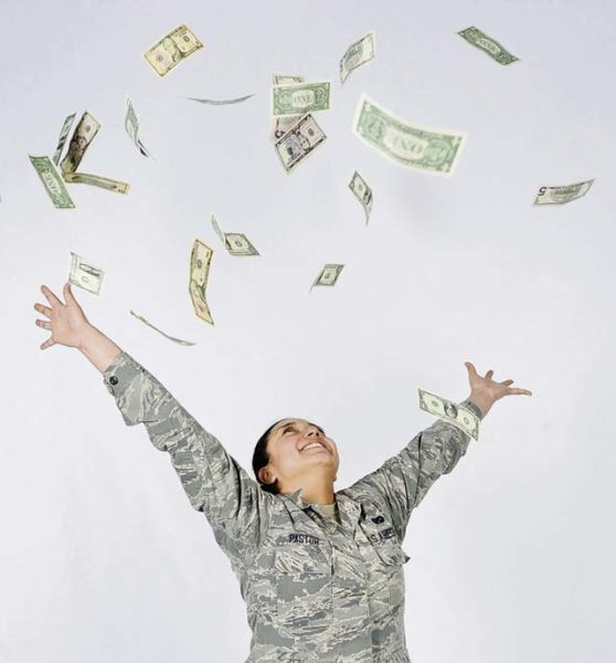 Airman 1st Class Daniela Pastor, 86th Airlift Wing Judge Advocate paralegal, throws money into the air April 7 on Ramstein Air Base. Beginning in 2018, service members have the opportunity to opt into a new Blended Retirement System, and can get automatic and matching Thrift Savings Plan contributions as well as mid-career compensation incentives in addition to a monthly annuity for life.
