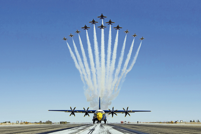 The squadron’s F/A-18 Super Hornets flew with their Air Force counterparts, the Thunderbirds’ F-16 Fighting Falcons, during a joint training exchange in California. And the Blue Angels’ transport aircraft, a C-130J affectionately known as “Fat Albert,” joined the Marine Corps Silent Drill Platoon for a photoshoot in Arizona.