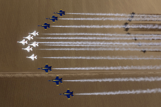 The United States Air Force Air Demonstration Squadron, known as the “Thunderbirds,” and the U.S. Navy Flight Demonstration Squadron, the “Blue Angels,” perform joint training over Naval Air Facility El Centro, California, Feb. 28, 2023. The Thunderbirds and Blue Angels spent a week at NAF El Centro sharing best practices and exchanging lessons learned in preparation for the upcoming air show season. (U.S. Air Force photo by Senior Airman Dakota B. Carter)