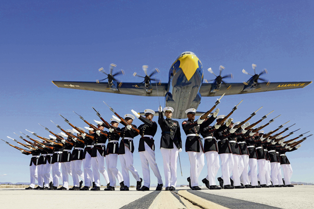 U.S. Marines with Silent Drill Platoon, Marine Barracks Washington, execute their drill sequence during the Blue Angels’ “Fat Albert” C-130J Super Hercules fly-over at Marine Corps Air Station Yuma, Arizona, Feb. 28, 2023. The Silent Drill Platoon and the Blue Angels flight crew held a photoshoot on the MCAS Yuma runway. (U.S. Marine Corps photo by Lance Cpl. Gideon M. Schippers)