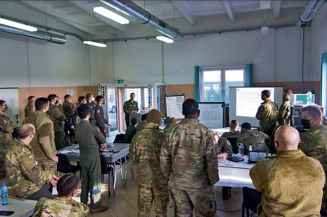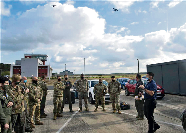 Airmen from the 37th Airlift Squadron and 435th Contingency Response group receive a safety briefing from a U.S. Air Force foreign liaison at 33rd Air Base near Powidz, Poland, during Aviation Detachment Rotation 21-1, Oct. 19. In order to maintain force health protection, Airmen follow risk-based measures consistent with guidance from the Department of Defense, Centers for Disease Control and Prevention and the host nation.