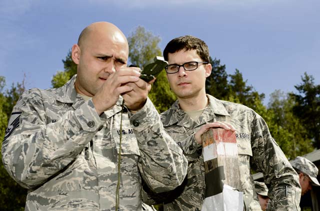 Master Sgt. Steven Hollatz (left), 7th Weather Squadron logistics and resources NCO in charge, and Staff Sgt. Cody Weakland, 7th WS battlefield weather Airman, ensure the accuracy of their compass during an annual training exercise known as Cadre Focus Sept. 16 at Grafenwoehr Training Area in Germany. Approximately 30 Airmen took part in Cadre Focus, an exercise designed to improve forecasting and Army skills such as land navigation and group movements.