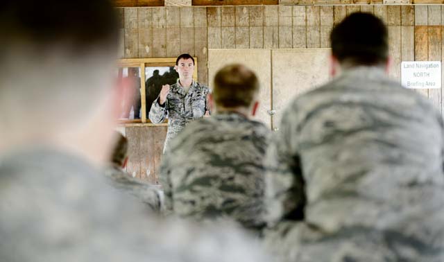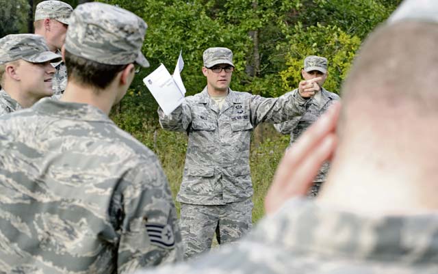 Tech. Sgt. Benjamin Hall, 7th Weather Squadron battlefield weather Airman, conducts a post-exercise briefing after 7th WS Airmen completed a land navigation course Sept. 16 at Grafenwoehr Training Area. Land navigation was one of many skills covered by instructors during Cadre Focus, an exercise designed to improve the services the 7th WS provides to Army units throughout Europe.