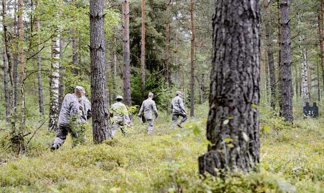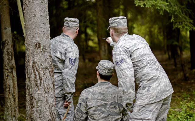 Battlefield weather Airmen enter a forest in search of a land navigation objective during an annual training exercise Sept. 16 at Grafenwoehr Training Area. Battlefield weather Airmen from detachments around Europe came together for a week to train and show each other skills and abilities they had learned working side-by-side with the Army.