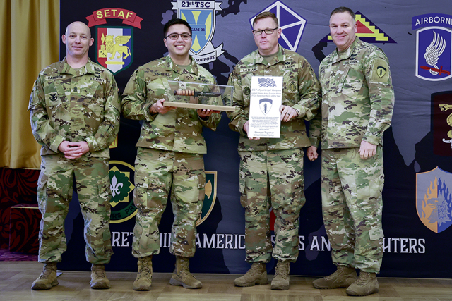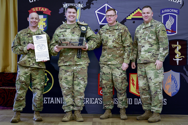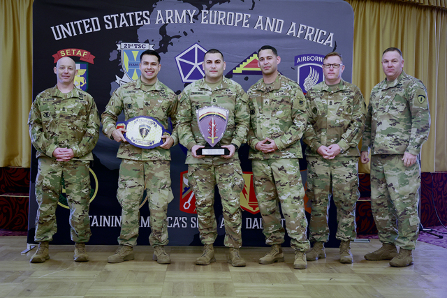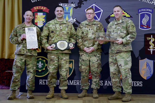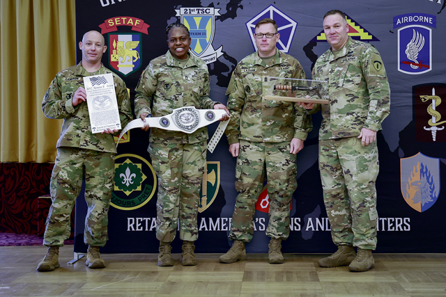 U.S. Army career counselors from U.S. Army Southern European Task Force, Africa pose for a photo as they are awarded with the “large command” retention award. This award was a part of the career counselor and retention non-commissioned officer of the year board fiscal year ‘24 event hosted by U.S. Army Europe and Africa at the Armstrong Club, Vogelweh Military Complex, Kaiserslautern, Germany, on March 7, 2024. SETAF-AF won the award with a retention completion goal of 116.4 percent for fiscal year 2023. (U.S. Army photo by Spc. Samuel Signor)