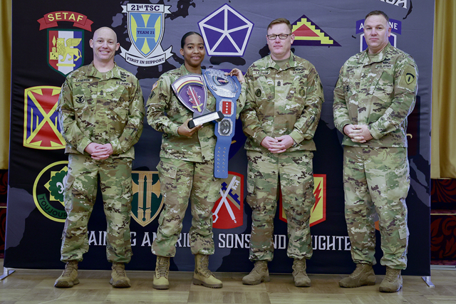 U.S. Army Sgt. 1st Class Teresa Grice, senior career counselor, U.S. Army Europe and Africa, poses for a photo as she is awarded with the “FY24 Reserve Component Career Counselor of the Year” award. She was recognized after winning the retention board at her level at the career counselor and retention non-commissioned officer of the year board fiscal year ‘24 event hosted by U.S. Army Europe and Africa at the Armstrong Club, Vogelweh Military Complex, Kaiserslautern, Germany, on March 7, 2024. The winners of these awards will represent U.S. Army Europe and Africa at the Secretary of the Army’s career counselor of the year competition later this month. (U.S. Army photo by Spc. Samuel Signor)