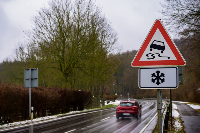 Car,Passing,On,A,Wet,,Mountain,Road,In,Winter,With