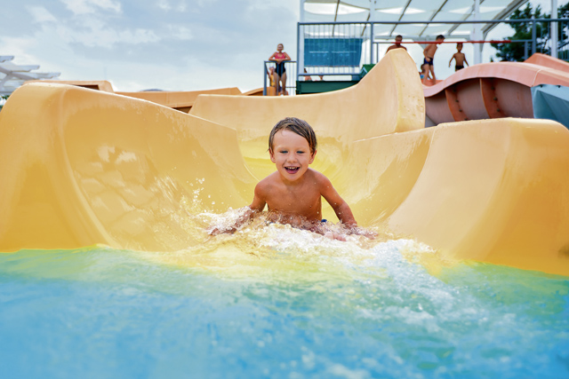 Cheerful,Blue-eyed,Kid,On,A,Water,Slide,In,The,Water