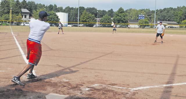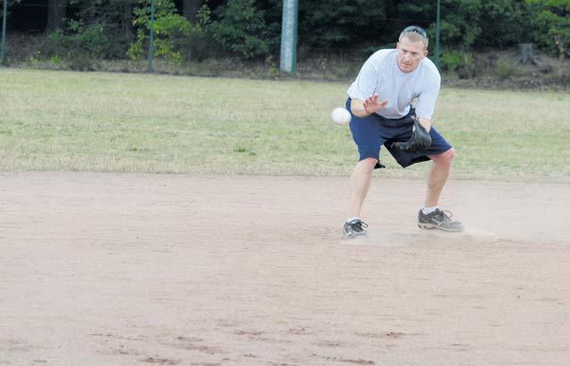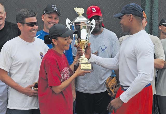 Colonels and chiefs from around the KMC participated in the third annual Chiefs versus Eagles softball game Monday on Ramstein. The game is held once a year to build camaraderie between officers and enlisted Airmen. The first two years, the Chiefs took home the trophy. This year, after a slow start to the game, the colonels came back to win the game with a final score of 11-9.