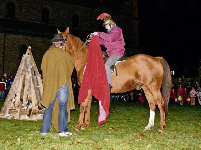 St. Martin divides his coat during the Martin’s play, which takes place after the parade through town tonight. — Photos by Stefan Layes