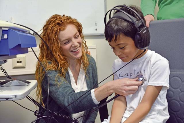 Stephanie Garner, nurse administrator for the Telehealth program at Landstuhl Regional Medical Center, helps Kai Matzkanin, a first-grade student from Landstuhl Elementary Middle School, listen to his own heartbeat using telehealth tools May 13 at LRMC. Students from Melinda Stevens’ class visited the LRMC telehealth team to learn firsthand how technology helps health care providers treat patients all over the world. The children have been studying space recently and learning how astronauts receive health care when they are not on Earth. During their visit, the kids demonstrated telehealth with a doctor remotely looking in their ears and listening to their hearts beating.