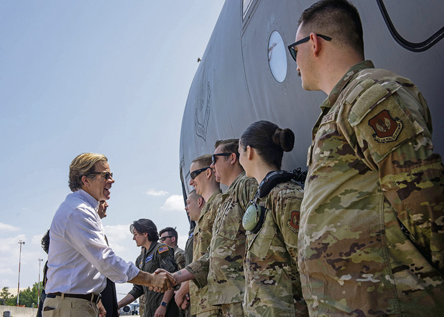 U.S. representatives shake hands with United States Air Forces in Europe – Air Forces Africa service members during a congressional delegation visit at Ramstein Air Base, June 19. The visit familiarized members of the House Committee on Science, Space and Technology, to American interests in the defense, space, aeronautics, science and technology sectors across Central Europe.
