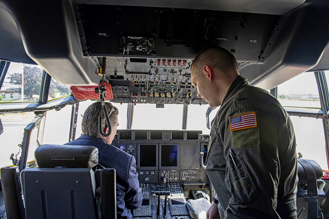 A U.S. Airman assigned to the 86th Airlift Wing showcases the flight deck of a C-130J Super Hercules aircraft to a U.S. representative.