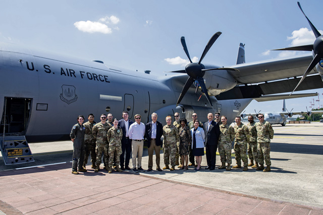 U.S. Air Force Senior Airman Lydia Knight, 37th Airlift Squadron loadmaster, speaks with U.S. congressional delegation members.