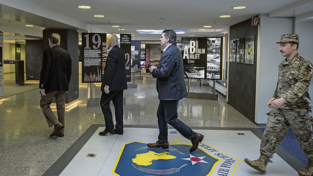 U.S. congressional delegation members enter the United States Air Forces in Europe – Air Forces Africa headquarters building during a visit at Ramstein Air Base, June 19.
