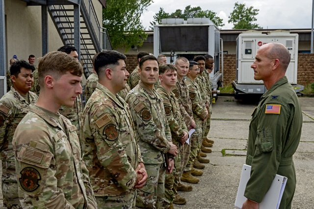 U.S. Air Force Col. Nathan D. Bump, 86th Airlift Wing deputy commander, speaks with airmen assigned to the 786th Civil Engineer Squadron during a wing immersion at Ramstein Air Base, Germany, July 14, 2025. The immersion provided a platform for Airmen to engage with incoming wing leadership and discuss the critical role their mission plays in overall operations. (U.S. Air Force photo by Airman 1st Class Jason Jones Jr.)