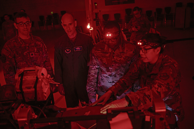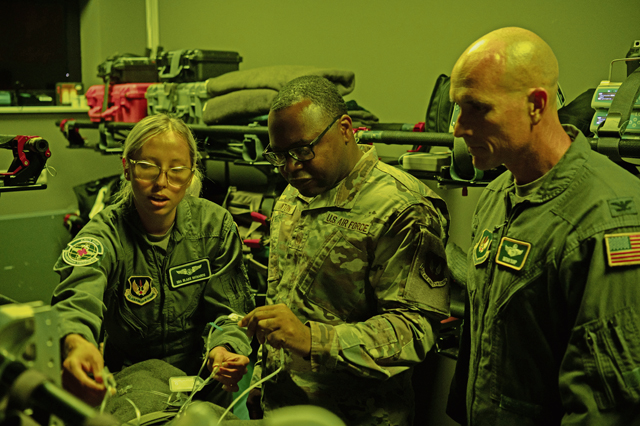 U.S. Air Force Col. Nathan D. Bump, 86th Airlift Wing deputy commander, and Chief Master Sgt. Clifford L. Lawton, 86th AW command chief, work alongside critical care air transport team members during a wing immersion at Ramstein Air Base, Germany, July 14, 2025. During the immersion, Bump and Lawton explored multiple squadrons to learn firsthand about the diverse capabilities each unit brings to the mission. (U.S. Air Force photo by Airman 1st Class Jason Jones Jr.)