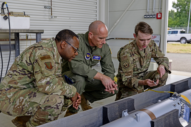 U.S. Air Force Col. Nathan D. Bump, 86th Airlift Wing deputy commander, and Chief Master Sgt. Clifford L. Lawton, 86th AW command chief, inspect ammunition during an immersion at Ramstein Air Base, Germany, July 14, 2025. Bump and Lawton visited various squadrons across Ramstein to gain a deeper understanding of their unique capabilities. (U.S. Air Force photo by Airman 1st Class Jason Jones Jr.)