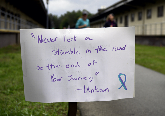 Inspirational quotes lined the straight-away portion of the Suicide Prevention walk and run course at Ramstein Air Base, Germany, Sept. 10, 2022. Runners and walkers were able to take breaks, mingle and read the signs posted along the route. If you or someone you know needs help, contact the Veterans Crisis Line at 00800-1273-8255. (U.S. Air Force photo by Airman 1st Class Lauren Jacoby)