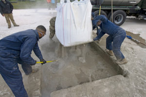 Members of the 786th Civil Engineer Squadron mix cement during exercise Operation Varsity 20-04 at Ramstein Air Base, Oct. 20, 2020. The 786th CES Airmen formed a Rapid Airfield Damage Repair team to simulate airfield repair in the event the airfield was damaged by airstrikes. The exercise, held from Oct. 13-23, tested the sustainability and readiness of base personnel. (U.S. Air Force photo by Airman 1st Class Taylor D. Slater)