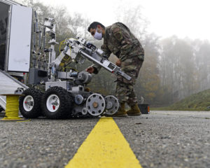 U.S. Air Force Staff Sgt. Emilio Solis, a 786th Civil Engineer Squadron explosive ordnance disposal team leader, prepares a robot to be used in a training exercise at Ramstein Air Base, Nov. 9, 2020. The EOD flight uses robots to defuse or detonate explosives so personnel don’t have to expose themselves to dangerous situations that could result in injury. (U.S. Air Force photo by Senior Airman Thomas Karol)